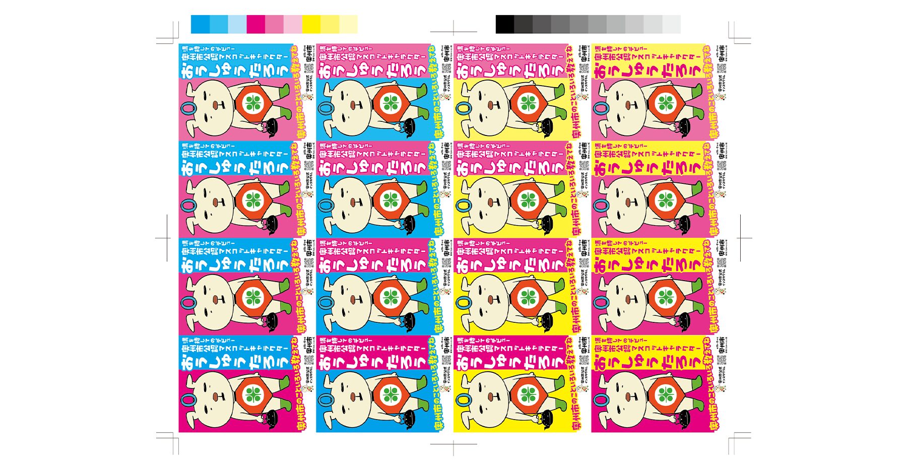 キャラクターのコンセプトと、市が描く今後の展開ロードマップを読み解き、その世界観を言葉で表現するキャッチコピーを考案。名前は仮称を入れた状態で、複数のレイアウトパターンと配色バリエーションを制作し、クライアントに提示しました。