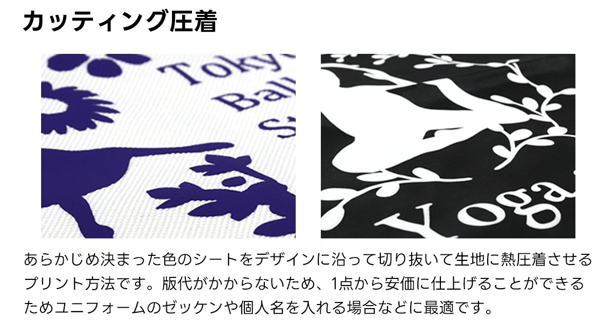 一方、カッティング圧着は単色専用の手法ですが、版が不要で、特殊なシートをカットして熱で圧着するため、少ロットでもコストを抑えられます。さらに、カッティングシートには光沢や蛍光など様々な種類があり、非常に鮮やかな発色が特徴です。