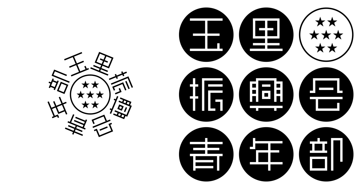 「玉里振興会青年部」という名称は、合計で8文字です。これを最も安定感のある3×3のグリッドに配置するため、あえて文字ではない「第9のピース」として七つ星のアイコンを加えました。